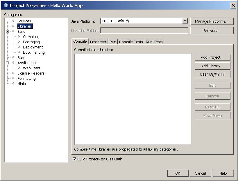 To specify this JDK for the current project only, select Hello World App in the Projects pane, choose File | Project Properties (Hello World App), click Libraries, then select JDK 1.8 in the Java Platform pulldown menu. You should see a screen similar to the following: