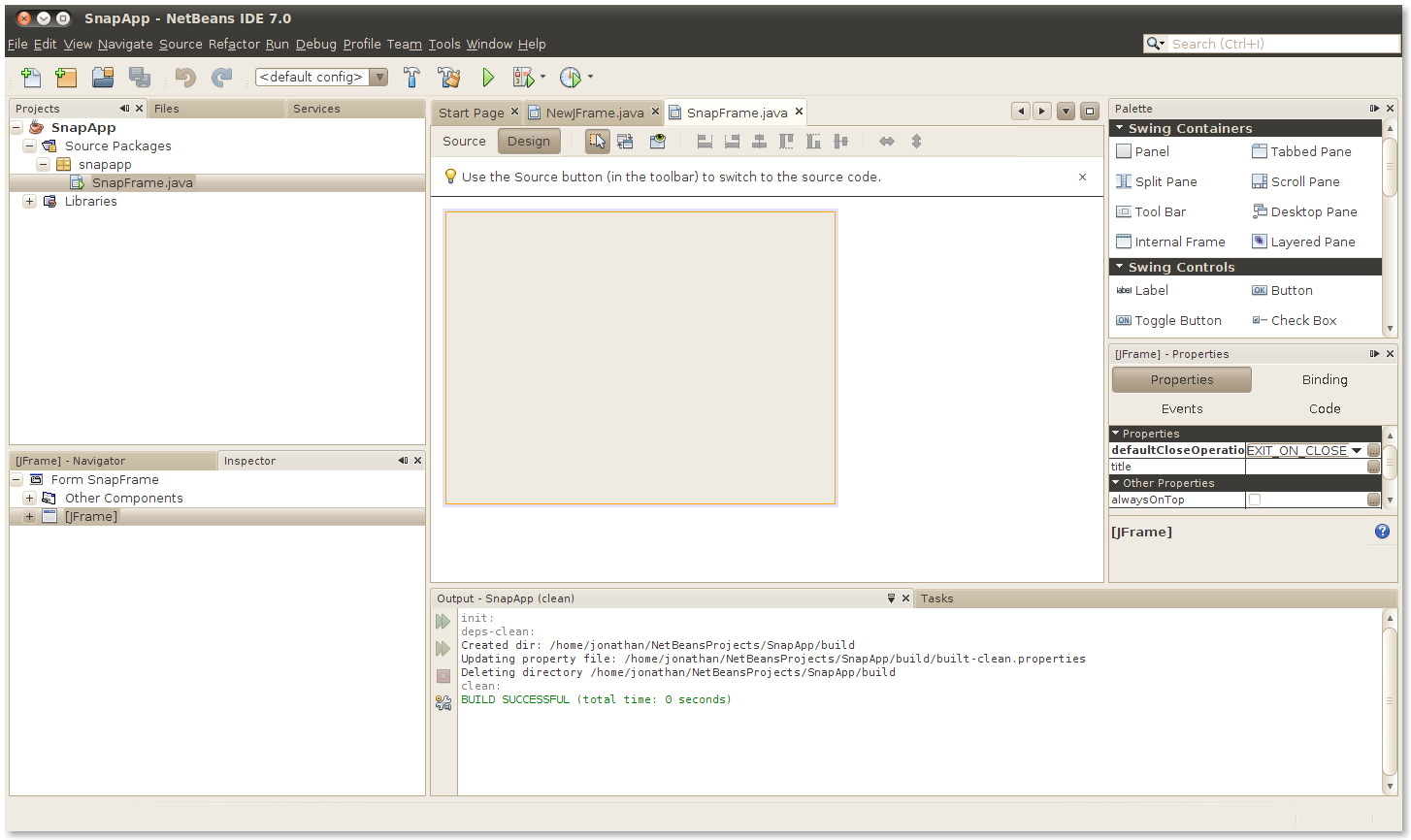 Fill in SnapFrame for the class name and snapapp as the package. Click Finish. NetBeans creates the new class and shows its visual designer: