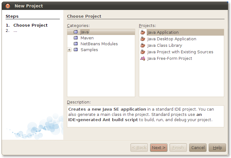 Select Java from the Categories list and select Java Application from the Projects list. Click Next >.