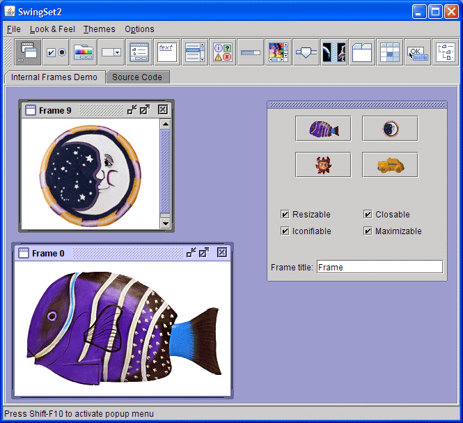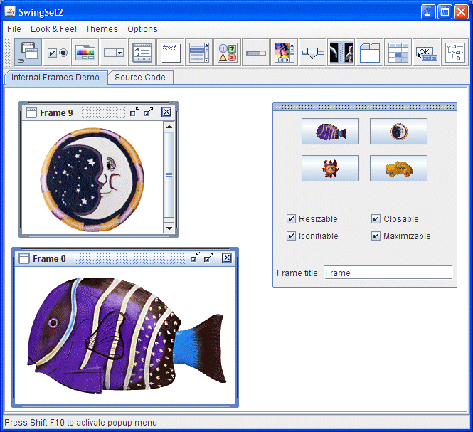 JDK and JavaFX Demos and Samples bundle and open it up, there is a demo\jfc folder that contains a demonstration program called SwingSet2. This program has a graphically rich GUI and allows you to change the Look and Feel from the menu. Further, if you are using the Java (Metal) Look and Feel, you can choose a variety of different themes. The files for the various themes (for example, RubyTheme.java) are found in the SwingSet2\src folder.